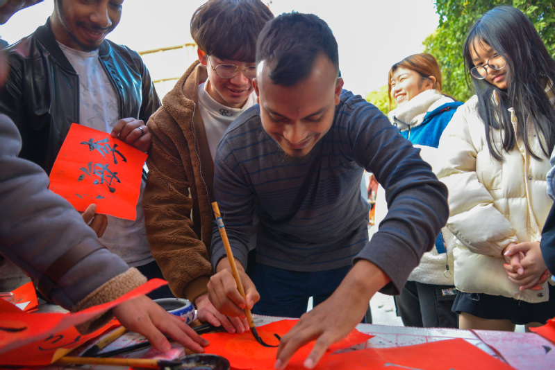 現(xiàn)場(chǎng)院團(tuán)委書法社團(tuán)和各系宣傳部的同學(xué)們揮毫潑墨,灑下新年祝福的話語, 活動(dòng)現(xiàn)場(chǎng)還吸引了我院外國(guó)留學(xué)生一同為新年寫下祝福。一幅幅寓意祥瑞的春聯(lián),一個(gè)個(gè)飽含神韻的“?!弊炙偷搅私搪毠ず屯瑢W(xué)們的手中,活動(dòng)現(xiàn)場(chǎng)已然是一片喜慶的紅色海洋。師生一邊欣賞書法技藝,一邊品評(píng)春聯(lián)寓意,都爭(zhēng)先迎“?!被丶遥矏傊橐缬谘员?。整個(gè)活動(dòng)現(xiàn)場(chǎng)翰墨的清香與眾人的歡笑,讓濃濃的年味提前灑滿交院。