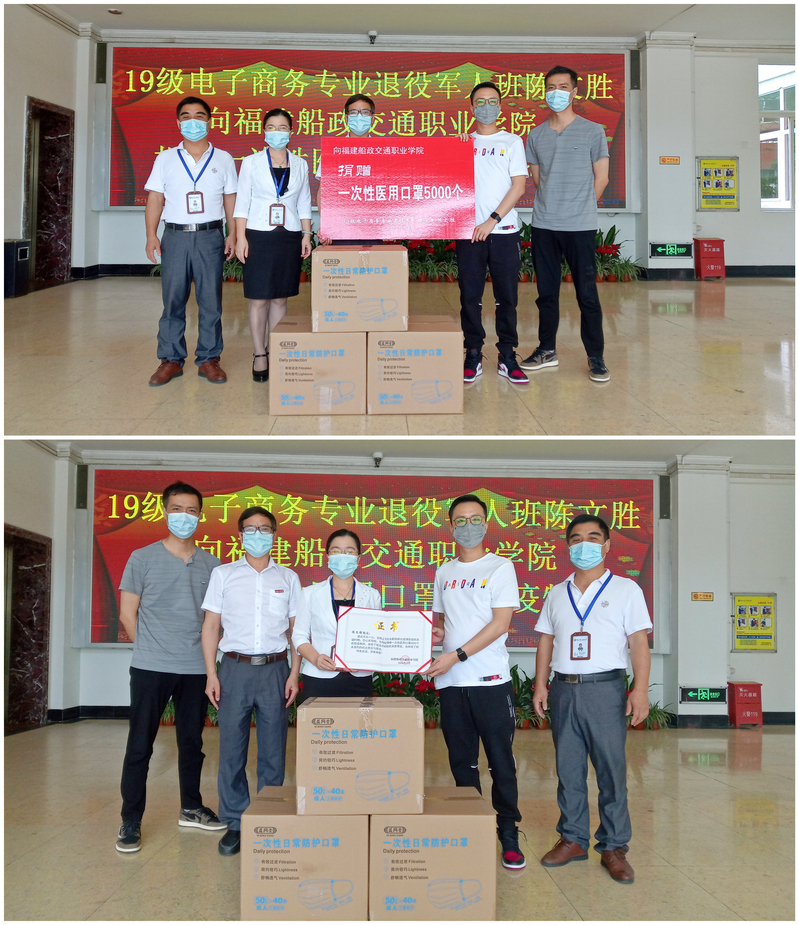 5月14日上午,19級(jí)電子商務(wù)專(zhuān)業(yè)退役軍人班陳文勝同學(xué)向?qū)W院捐贈(zèng)一次性醫(yī)用口罩5000個(gè)。學(xué)院黨委副書(shū)記陳宜大、副院長(zhǎng)陳艷紅代表學(xué)院接收了該批物資。