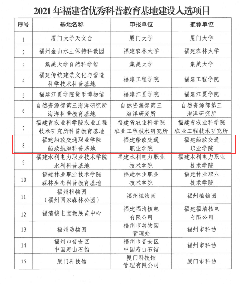 近日,根據(jù)福建省科學(xué)技術(shù)協(xié)會下發(fā)的《關(guān)于簽訂2021年福建省優(yōu)秀科普教育基地建設(shè)項目任務(wù)書的函》,我院船政航??破栈爻晒θ脒x2021年“福建優(yōu)秀科普基地”建設(shè)項目。