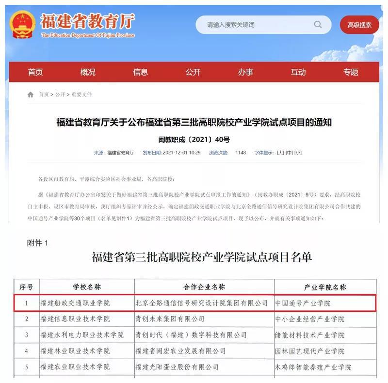 根據(jù)《福建省教育廳關(guān)于公布福建省第三批高職院校產(chǎn)業(yè)學(xué)院試點(diǎn)項(xiàng)目的通知》(閩教職成〔2021〕40號(hào)),福建船政交通職業(yè)學(xué)院與北京全路通信信號(hào)研究設(shè)計(jì)院集團(tuán)有限公司合作建立的中國(guó)通號(hào)產(chǎn)業(yè)學(xué)院成功入選福建省第三批高職院校產(chǎn)業(yè)學(xué)院試點(diǎn)項(xiàng)目,這是福建船政交通職業(yè)學(xué)院堅(jiān)持立德樹人根本宗旨、落實(shí)產(chǎn)教融合創(chuàng)新發(fā)展的重要成果體現(xiàn)。