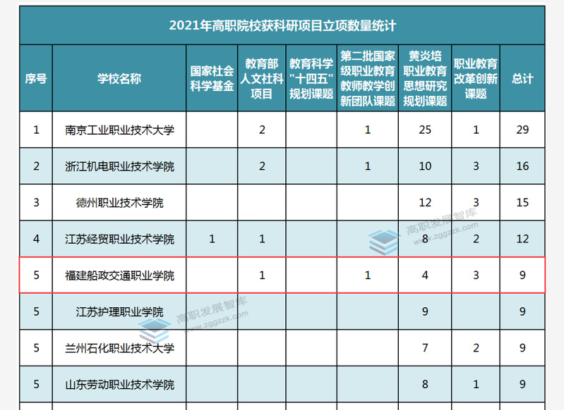 近期,高職發(fā)展智庫對高職院校榮獲國家級科研項目的有效數(shù)據(jù)進行統(tǒng)計與分析,福建船政交通職業(yè)學院全國排名第五,全省第一!