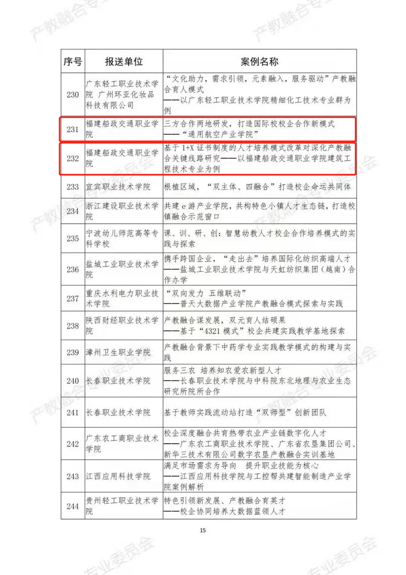 近日,中國教育發(fā)展戰(zhàn)略學(xué)會產(chǎn)教融合專業(yè)委員會發(fā)布《關(guān)于公布2021年產(chǎn)教融合校企合作典型案例名單的公告》,我院案例《三方合作兩地研發(fā),打造國際校校企合作新模式——“通用航空產(chǎn)業(yè)學(xué)院”》《基于1+X證書制度的人才培養(yǎng)模式改革對深化產(chǎn)教融合關(guān)鍵線路研究——以福建船政交通職業(yè)學(xué)院建筑工程技術(shù)專業(yè)為例》入選。