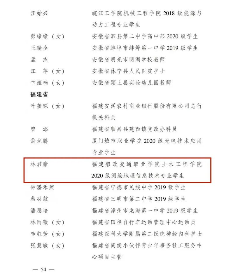 2022年是中國共青團(tuán)成立100周年,近日,共青團(tuán)中央作出表彰決定,授予293個團(tuán)組織全國五四紅旗團(tuán)委稱號,授予377個團(tuán)組織全國五四紅旗團(tuán)支部稱號,授予457人(含追授3人)全國優(yōu)秀共青團(tuán)員稱號,授予341人(含追授1人)全國優(yōu)秀共青團(tuán)干部稱號。我院土木工程學(xué)院2020級測繪地理信息技術(shù)專業(yè)林君豪同學(xué)被授予“全國優(yōu)秀共青團(tuán)員”榮譽稱號。