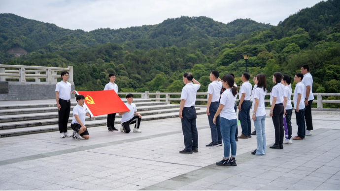 在中央蘇區(qū)松毛嶺戰(zhàn)役紀念碑前,全體黨員師生站立在這一片血染的紅土地上莊嚴宣誓,鏗鏘有力的入黨誓詞在松林山間回響。