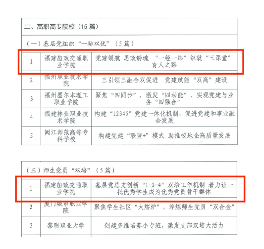 發(fā)布者:發(fā)布時間:2023-11-24瀏覽次數(shù):201 近日,省委教育工委公布全省高校“一融雙優(yōu)”基層黨建工作模式典型案例入選名單。我院黨委選送的《黨建領(lǐng)航 思政鑄魂“一經(jīng)一緯”織就“三課堂”育人之路》入選高職高專組基層黨組織“一融雙優(yōu)”工作案例,《基層黨總支創(chuàng)新“1-2-4”雙培工作機制 著力讓一批優(yōu)秀學生成為優(yōu)秀黨員骨干群體》入選高職高專組師生黨員“雙培”工作案例。
