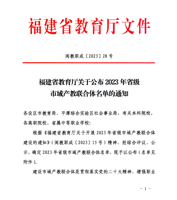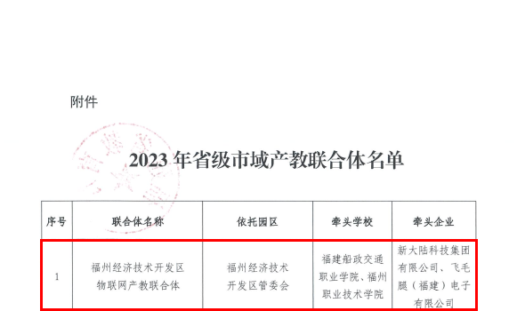 近日,福建省教育廳公布了2023年省級市域產教聯合體名單,以我院和福州職業(yè)技術學院為牽頭學校、新大陸科技集團有限公司和飛毛腿(福建)電子有限公司為牽頭企業(yè)、福州經濟技術開發(fā)區(qū)管委會為依托園區(qū)的福州經濟技術開發(fā)區(qū)物聯網產教聯合體成功入選。