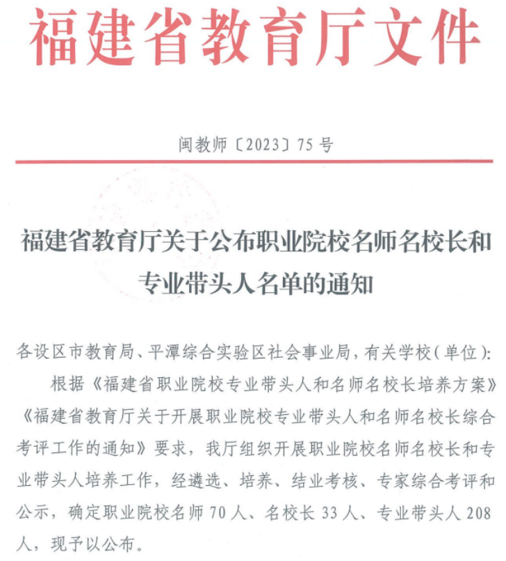 近日,《福建省教育廳關(guān)于公布職業(yè)院校名師名校長和專業(yè)帶頭人名單的通知》(閩教師〔2023〕75號)印發(fā),經(jīng)省教育廳遴選、培養(yǎng)、結(jié)業(yè)考核、專家綜合考評和公示,我院房曰榮、陳秀華被確定為福建省高職院校名師,高汝武被確定為福建省高職院校名校長,陳明仙、翁國玲、陳天炎、黃金鳳、蘇慶列、李翼被確定為福建省高職院校專業(yè)帶頭人。