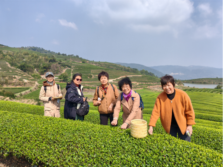 在云霧繚繞、風(fēng)景如畫的長龍茶山,大家認(rèn)真聆聽茶文化講解,進(jìn)行采茶體驗(yàn)。根據(jù)”兩葉一芯”的采摘標(biāo)準(zhǔn),手指一捏一提一放,將茶芽放入茶簍里。圍爐煮茶,茶香裊裊,大家暢然心懷,感受中華茶文化的魅力。
