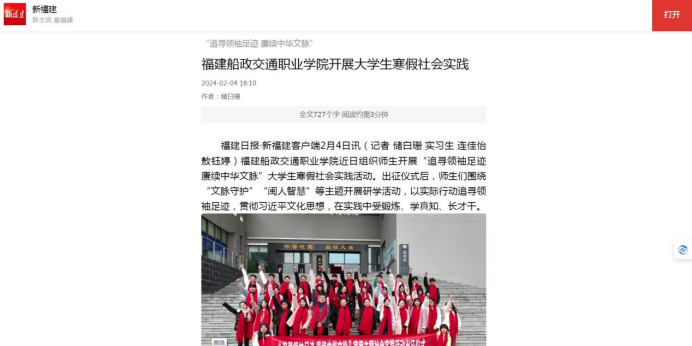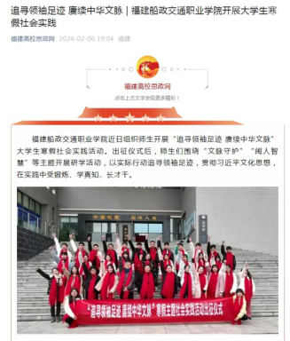 學(xué)院認(rèn)真落實(shí)福建省委教育工委要求,統(tǒng)籌部署、協(xié)同開(kāi)展“追尋領(lǐng)袖足跡 賡續(xù)中華文脈”大學(xué)生寒假社會(huì)實(shí)踐,成立社會(huì)實(shí)踐隊(duì),走進(jìn)嚴(yán)復(fù)故居、嚴(yán)復(fù)博物館等場(chǎng)所,開(kāi)展“文脈守護(hù)”“閩人智慧”等主題開(kāi)展研學(xué)活動(dòng),把“小我”融入到“大我”,在社會(huì)實(shí)踐中堅(jiān)定前行方向、找準(zhǔn)人生坐標(biāo)、扛起責(zé)任擔(dān)當(dāng)。本次主題社會(huì)實(shí)踐活動(dòng)得到學(xué)習(xí)強(qiáng)國(guó)福建學(xué)習(xí)平臺(tái)、福建高校思政網(wǎng)、新福建等多家媒體報(bào)道,取得了良好的育人成效和社會(huì)認(rèn)可。