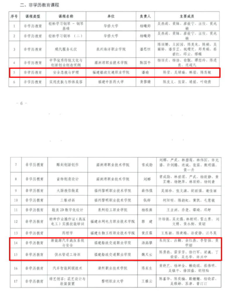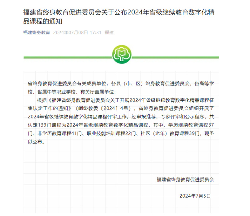 近日,福建省終身教育促進(jìn)委員會(huì)公布《2024年省級(jí)繼續(xù)教育數(shù)字化精品課程》,共認(rèn)定139門課程為2024年省級(jí)繼續(xù)教育數(shù)字化精品課程,其中,學(xué)歷繼續(xù)教育課程37門、非學(xué)歷教育課程41門、職業(yè)技能培訓(xùn)課程22門、社區(qū)(老年)教育課程39門。我院非學(xué)歷教育課程《安全急救與護(hù)理》《新能源汽車高壓系統(tǒng)與安全》《供水管道工培訓(xùn)》、社區(qū)(老年)教育課程《晚年出行新模式》共四門課程成功入選。