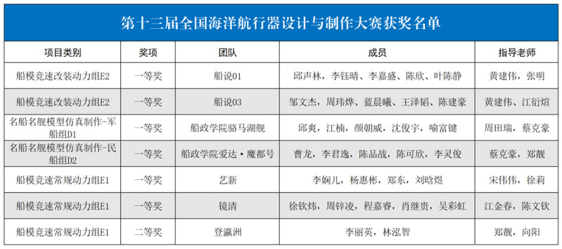 我院代表隊在新概念創(chuàng)意設(shè)計、設(shè)計與制作、艦船模型智能航行、名船名艦仿真制作、海洋知識競賽等多個賽道中斬獲一等獎6個、二等獎1個,成績斐然!