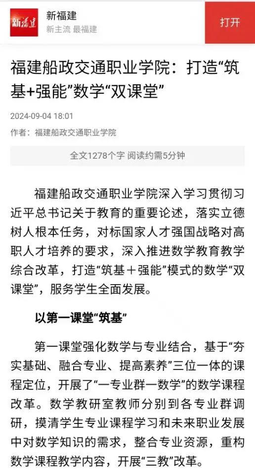 福建船政交通職業(yè)學(xué)院深入學(xué)習(xí)貫徹習(xí)近平總書記關(guān)于教育的重要論述,落實立德樹人根本任務(wù),對標(biāo)國家人才強國戰(zhàn)略對高職人才培養(yǎng)的要求,深入推進(jìn)數(shù)學(xué)教育教學(xué)綜合改革,打造“筑基+強能”模式的數(shù)學(xué)“雙課堂”,服務(wù)學(xué)生全面發(fā)展。