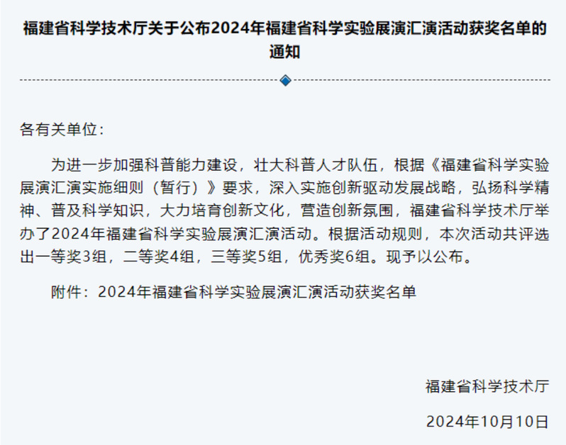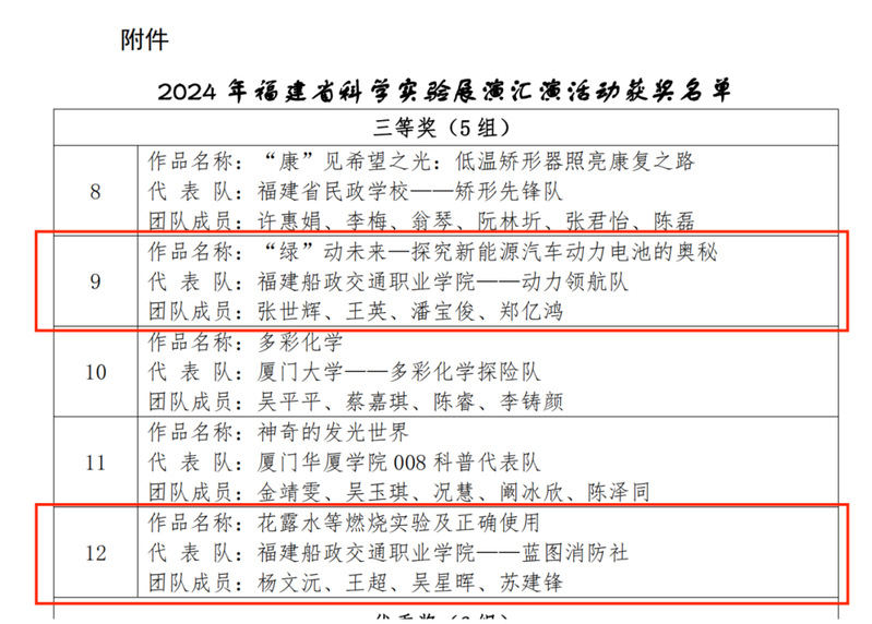 近日,由福建省科學(xué)技術(shù)廳主辦的2024年福建省科學(xué)實驗展演匯演大賽在福州舉行,我院科技處選送的汽車學(xué)院作品“‘綠’動未來—探究新能源汽車動力電池的奧秘”科普實驗項目、安全與環(huán)境學(xué)院作品“花露水等燃燒實驗及正確使用”科普實驗項目榮獲三等獎。