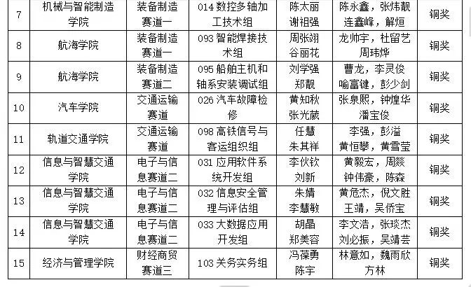 在激烈的競(jìng)賽中,我院學(xué)子沉著冷靜,發(fā)揮出色,勇獲佳績(jī)。在會(huì)計(jì)實(shí)務(wù)、電子商務(wù)2個(gè)賽項(xiàng)榮獲金獎(jiǎng),在生產(chǎn)事故應(yīng)急救援、智能飛行器應(yīng)用技術(shù)、智能網(wǎng)聯(lián)汽車技術(shù)、機(jī)器人系統(tǒng)集成應(yīng)用技術(shù)4個(gè)賽項(xiàng)榮獲銀獎(jiǎng),在數(shù)控多軸加工技術(shù)、智能焊接技術(shù)、船舶主機(jī)和軸系安裝調(diào)試、汽車故障檢修、高鐵信號(hào)與客運(yùn)組織、應(yīng)用軟件系統(tǒng)開發(fā)、信息安全管理與評(píng)估、大數(shù)據(jù)應(yīng)用開發(fā)、關(guān)務(wù)實(shí)務(wù)9個(gè)賽項(xiàng)榮獲銅獎(jiǎng),獲獎(jiǎng)數(shù)量位居全省第一。同時(shí)受我院邀請(qǐng),由烏干達(dá)工程機(jī)械技能培訓(xùn)中心組成的國際代表隊(duì),在我院汽車學(xué)院黃林火老師的指導(dǎo)下,榮獲交通運(yùn)輸賽道起動(dòng)系統(tǒng)故障排查小組銅獎(jiǎng)。