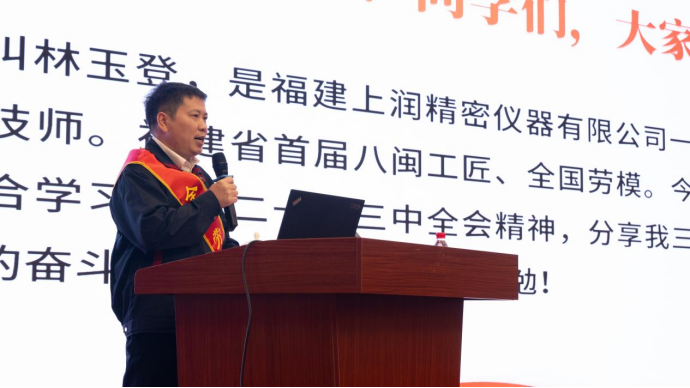 啟動儀式后,全國勞動模范、全國技術(shù)能手、享受國務(wù)院政府特殊津貼專家福建上潤精密儀器有限公司林玉登分享他30年工作的艱辛歷程和生動事跡。他三十年如一日認(rèn)真做好精密制造這一件事,“簡單的事情重復(fù)做,重復(fù)的事情堅(jiān)持做”,他用堅(jiān)持不懈、永不放棄的精神為推動福建傳統(tǒng)產(chǎn)業(yè)轉(zhuǎn)型升級和智能制造做出了積極貢獻(xiàn)。在場的觀眾都從林玉登勞模事跡中深刻感悟勞模精神、勞動精神、工匠精神的實(shí)質(zhì)內(nèi)涵。