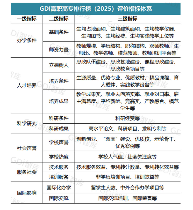 據悉,GDI智庫發(fā)布榜單以教育部最新一次公布的《全國普通高等學校名單》為依據,設置辦學條件、人才培養(yǎng)、科學研究、社會聲譽、服務社會和國際影響等6個一級指標,下設師資力量、培養(yǎng)成果、科研成果、學校聲譽、技術服務、培訓服務等13個二級指標以及150多個細分指標,全面、客觀地對高職院校發(fā)展現狀作出科學評價。