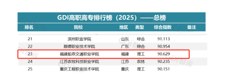 近日,GDI智庫發(fā)布“GDI高職高專排行榜(2025)”,對全國1560所高職院校(不含香港特別行政區(qū)、澳門特別行政區(qū)和臺灣地區(qū)院校)進行科學評價。我院綜合排名位列總榜第23位,省內綜合排名位列第一。