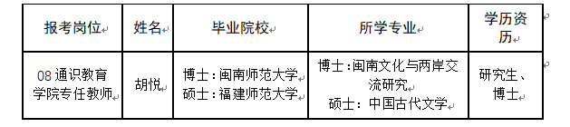 按照《關(guān)于印發(fā)<福建省省屬事業(yè)單位公開招聘工作人員考試暫行辦法>的通知》(閩人發(fā)〔2006〕11號)和《2024年福建船政交通職業(yè)學院專項公開招聘總量控制高層次人才方案(二)》等文件要求,經(jīng)報名、資格審查、面試、考察、體檢等有關(guān)程序,經(jīng)學校黨委會議研究,確定胡悅為08通識教育學院專任教師擬聘用人員,現(xiàn)予以公示。
