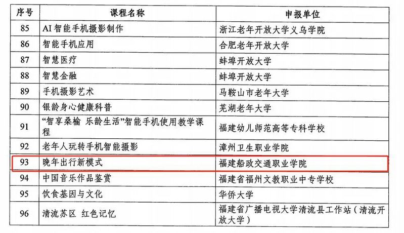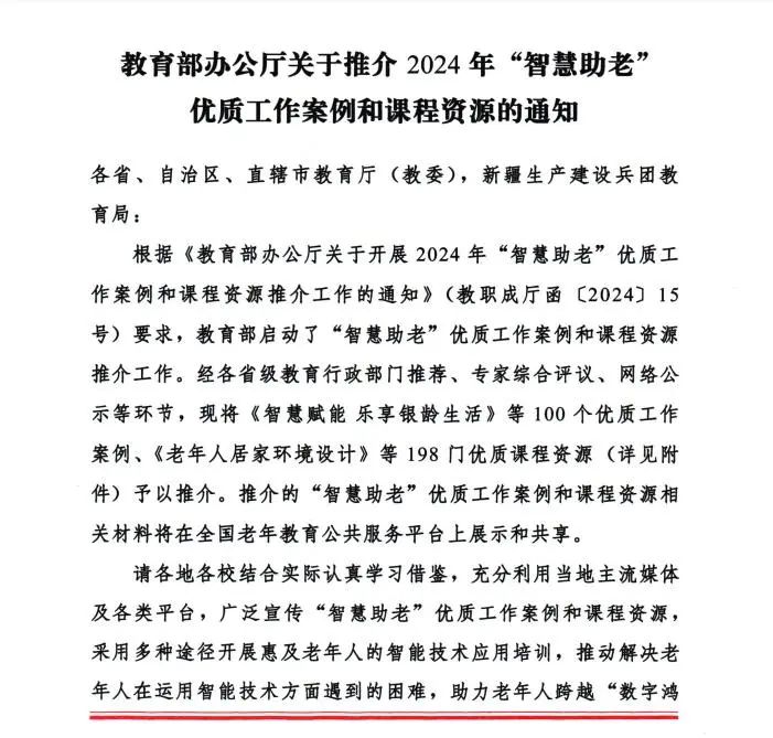 根據(jù)《教育部辦公廳關(guān)于推介2024年“智慧助老” 優(yōu)質(zhì)工作案例和課程資源的通知》,我院老年大學(xué)《晚年出行新模式》課程入選教育部“智慧助老”優(yōu)質(zhì)課程資源。