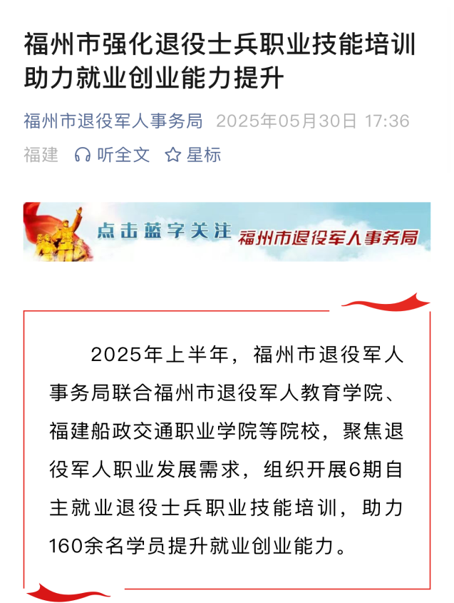 2025年上半年,福州市退役軍人事務局聯合福州市退役軍人教育學院、福建船政交通職業(yè)學院等院校,聚焦退役軍人職業(yè)發(fā)展需求,組織開展6期自主就業(yè)退役士兵職業(yè)技能培訓,助力160余名學員提升就業(yè)創(chuàng)業(yè)能力。