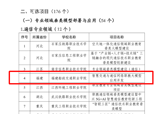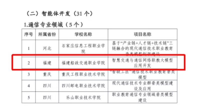 近日,教育部職業(yè)教育發(fā)展中心公布了“職業(yè)教育專業(yè)領域垂類模型建設項目(第一批)”入選名單,由我院信息與智慧交通學院團隊申報的“智慧交通與通信網(wǎng)絡職教大模型應用開發(fā)”項目成功入選,成為通信專業(yè)領域重點建設項目之一。