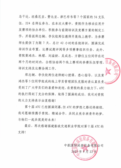 近日,由中航國際成套設(shè)備有限公司、肯尼亞教育部和中國教育國際交流協(xié)會(huì)聯(lián)合主辦的第十屆非洲職業(yè)技能挑戰(zhàn)賽(Africa Tech Challenge,簡稱“ATC”)圓滿落幕。我院信息與智慧交通學(xué)院師生團(tuán)隊(duì)全程護(hù)航移動(dòng)應(yīng)用開發(fā)賽項(xiàng),以專業(yè)師資精準(zhǔn)授課、青年志愿暖心服務(wù),圓滿完成了線上培訓(xùn)與技術(shù)保障任務(wù),并獲主辦單位中航國際成套設(shè)備有限公司專函致謝。