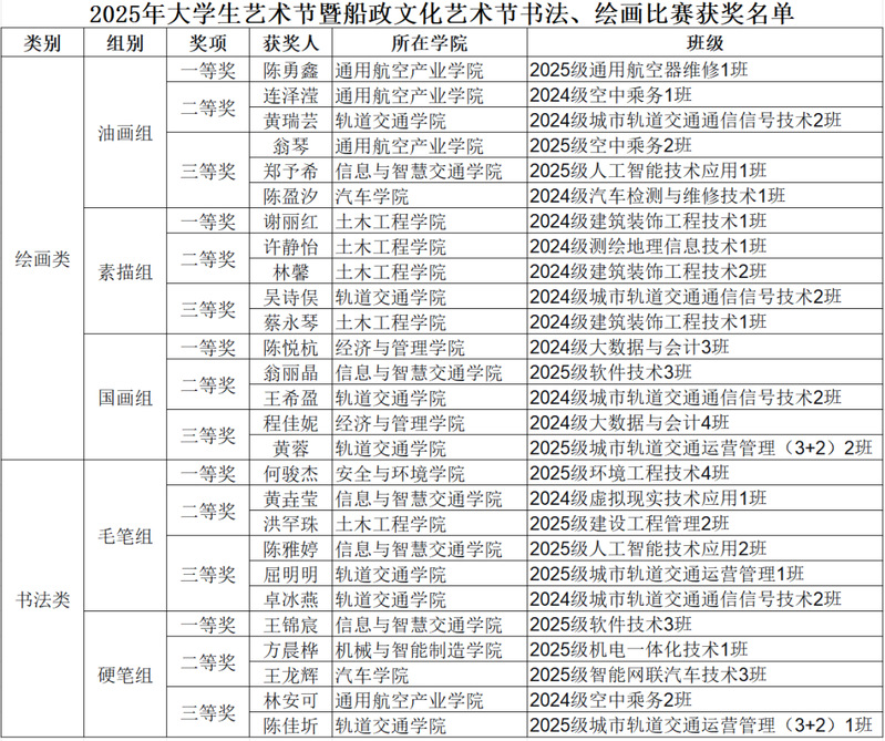 頒獎會上,還為獲得油畫、素描、國畫、毛筆、硬筆五個組別的一、二、三等獎的27名學(xué)生頒發(fā)獲獎證書,并授予經(jīng)濟(jì)與管理學(xué)院、通用航空產(chǎn)業(yè)學(xué)院、通識教育學(xué)院、滄浪書社“優(yōu)秀組織獎”。