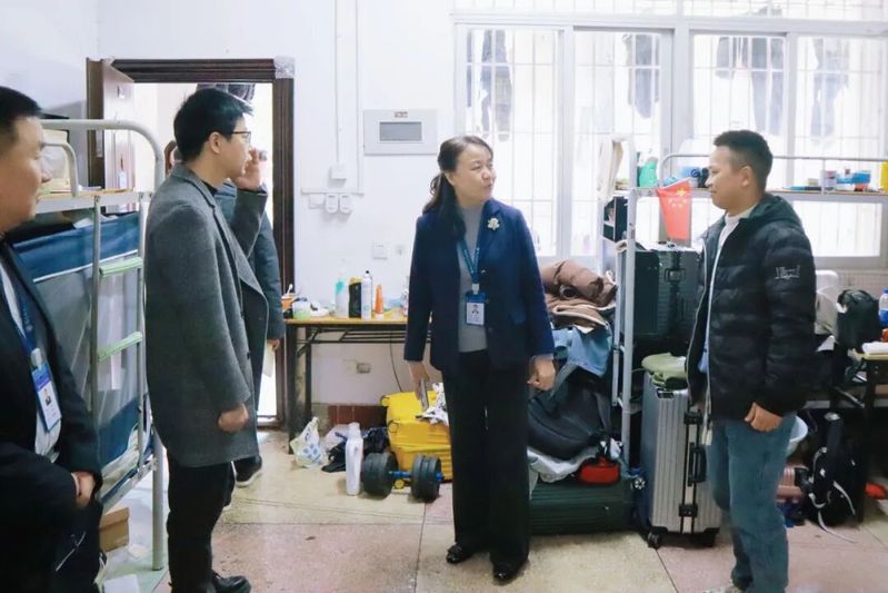 隨后,陳群院長(zhǎng)走進(jìn)學(xué)生宿舍走訪慰問(wèn),與同學(xué)們親切交談。她仔細(xì)詢問(wèn)了同學(xué)們的生源地和在校學(xué)習(xí)、生活等情況,以及對(duì)學(xué)院工作的意見(jiàn)建議。陳群院長(zhǎng)向同學(xué)們致以新年問(wèn)候,勉勵(lì)同學(xué)們不負(fù)韶華,砥礪自我,全面發(fā)展,勇于拼搏,追求人生出彩,展現(xiàn)青春力量,并祝愿他們?cè)诩磳⒌絹?lái)的2026年展現(xiàn)新?lián)?dāng),實(shí)現(xiàn)新作為,取得新成績(jī)。交流中,多位2025級(jí)同學(xué)表示,船政交通是自己的第一志愿,對(duì)學(xué)習(xí)、生活挺適應(yīng),引得在場(chǎng)人員贊許的笑聲。
