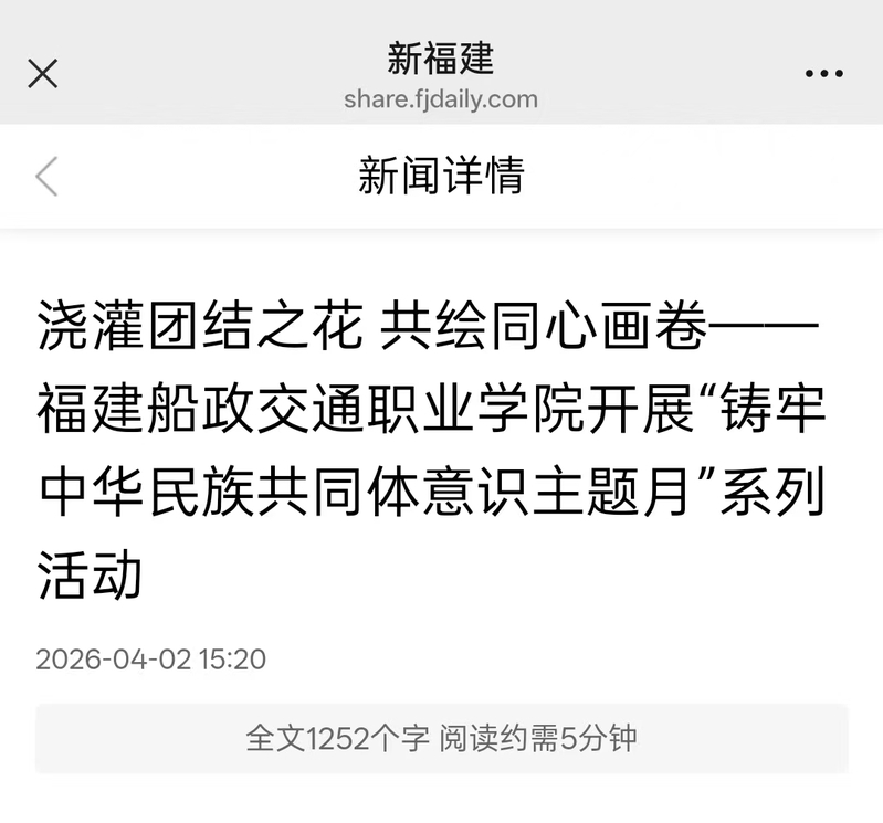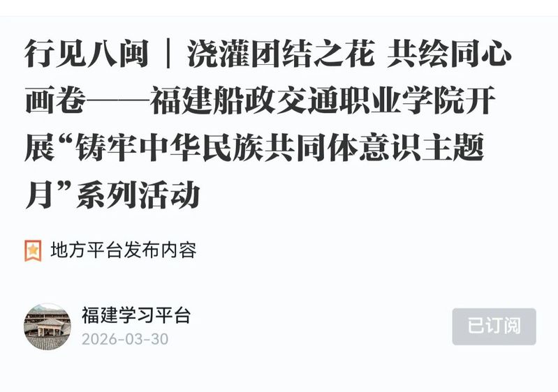 近日,學(xué)習(xí)強(qiáng)國(guó)福建學(xué)習(xí)平臺(tái)、福建高校思政網(wǎng)、新福建等主流媒體發(fā)布《澆灌團(tuán)結(jié)之花 共繪同心畫(huà)卷——福建船政交通職業(yè)學(xué)院開(kāi)展“鑄牢中華民族共同體意識(shí)主題月”系列活動(dòng)》,報(bào)道學(xué)院圍繞“鑄牢中華民族共同體意識(shí)”主線,精心組織開(kāi)展“鑄牢中華民族共同體意識(shí)主題月”系列活動(dòng)?;顒?dòng)開(kāi)展以來(lái),學(xué)院從座談交流、理論宣講、文化浸潤(rùn)、實(shí)踐體驗(yàn)、紅色教育五個(gè)維度精準(zhǔn)發(fā)力,組織全院師生廣泛參與、深度互動(dòng),進(jìn)一步凝聚起中華民族一家親、同心共筑中國(guó)夢(mèng)的強(qiáng)大合力。