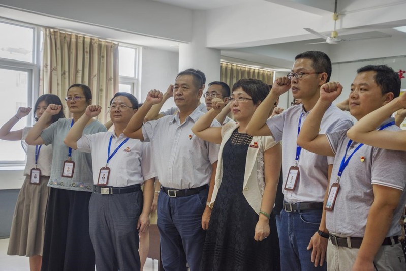 1.全體黨員舉行了重溫入黨誓詞的儀式。面對鮮紅的黨旗,全體黨員一起高舉右手,再次莊嚴(yán)宣誓?!拔抑驹讣尤胫袊伯a(chǎn)黨……隨時(shí)準(zhǔn)備為黨和人民犧牲一切,永不叛黨?!比w黨員聲音鏗鏘、句句千鈞,神情莊重地許下對黨和人民的承諾。