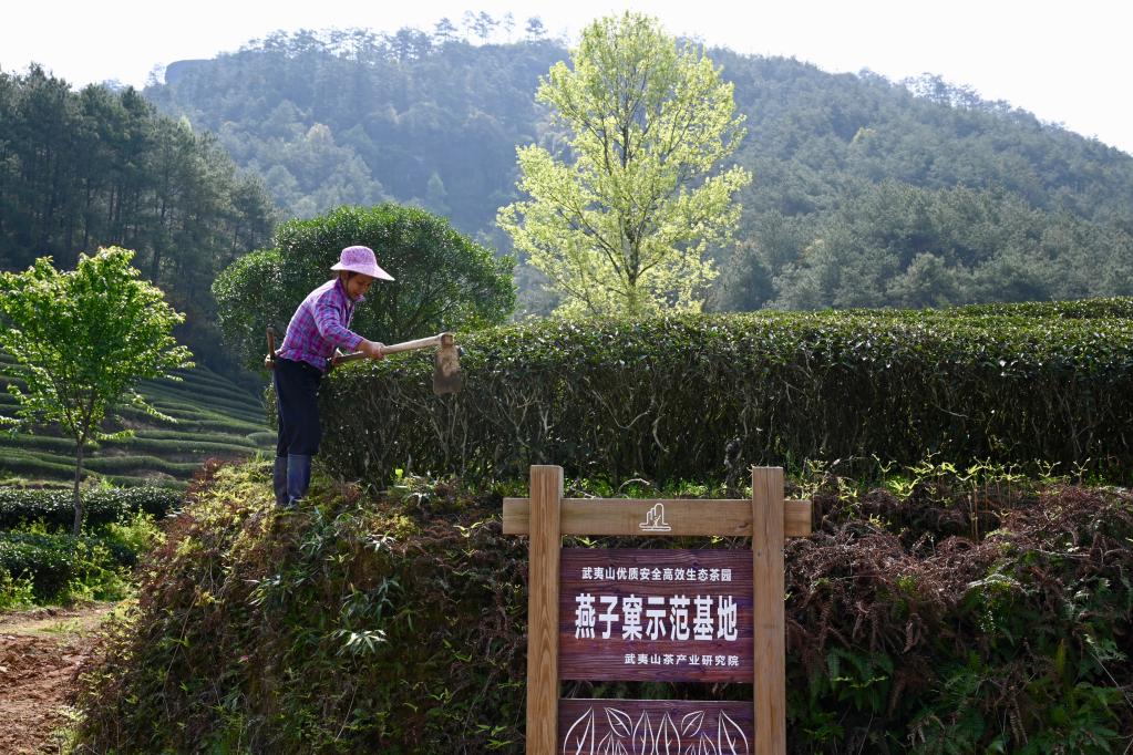 2021年3月23日,茶農(nóng)在武夷山星村鎮(zhèn)燕子窠生態(tài)茶園除草。新華社記者姜克紅攝