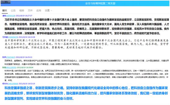 安全與環(huán)境第二黨支部黨員于8月19日集中學(xué)習(xí)了《習(xí)近平總書記在兩院院士大會、中國科協(xié)第十次全國代表大會上重要講話精神》,并在安全與環(huán)境第二黨支部QQ群里展開了熱烈討論。習(xí)近平總書記強(qiáng)調(diào)要激發(fā)各類人才創(chuàng)新活力,建設(shè)全球人才高地。硬實力、軟實力,歸根結(jié)底要靠人才實力。全部科技史都證明,誰擁有了一流創(chuàng)新人才、擁有了一流科學(xué)家,誰就能在科技創(chuàng)新中占據(jù)優(yōu)勢。我國要建設(shè)世界科技強(qiáng)國,關(guān)鍵是要建設(shè)一支規(guī)模宏大、結(jié)構(gòu)合理、素質(zhì)優(yōu)良的創(chuàng)新人才隊伍,激發(fā)各類人才創(chuàng)新活力和創(chuàng)造潛力。正如習(xí)近平總書記指出的:“世界科技強(qiáng)國必須能夠在全球范圍內(nèi)吸引人才、留住人才、用好人才。我國要實現(xiàn)高水平科技自立自強(qiáng),歸根結(jié)底要靠高水平創(chuàng)新人才。”