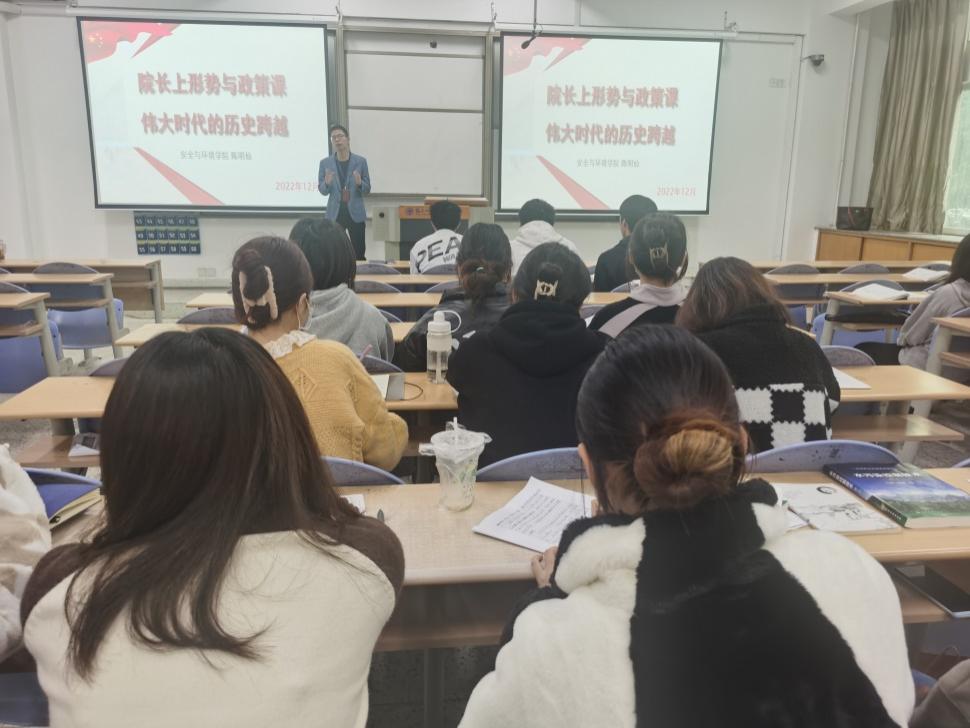 為更好貫徹落實(shí)中辦、國(guó)辦《關(guān)于深化新時(shí)代學(xué)校思想政治理論課改革創(chuàng)新的若干意見(jiàn)》,中組部、中宣部、教育部《關(guān)于領(lǐng)導(dǎo)干部上講臺(tái)開(kāi)展思想政治教育的意見(jiàn)》及省委教育工作領(lǐng)導(dǎo)小組《關(guān)于深化新時(shí)代學(xué)校思想政治理論課改革創(chuàng)新行動(dòng)方案》,安全與環(huán)境學(xué)院院長(zhǎng)陳明仙參與思政教研室的集體備課,于2022年12月8日,給安全與環(huán)境學(xué)院學(xué)生講授思政課、講授以“偉大時(shí)代的歷史跨越”為主題的形勢(shì)與政策課。