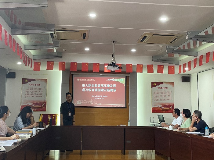 陳明仙院長結合雙高建設和學院發(fā)展,從建設中國特色社會主義教育強國、習近平總書記關于職業(yè)教育的論述和推進職業(yè)教育高質量發(fā)展舉措三個方面展開闡述,指出教育現(xiàn)代化發(fā)展的歷史性成就和格局性變化充分證明了中國特色社會主義教育發(fā)展道路的正確性。仰觀大局,教育的使命無比光榮、責任無比重大,要求大家要敢于擔當作為,勇于攻堅克難,在團結中奮進,在競爭中超越,在推動現(xiàn)代職業(yè)教育高質量發(fā)展的新征程中貢獻力量。