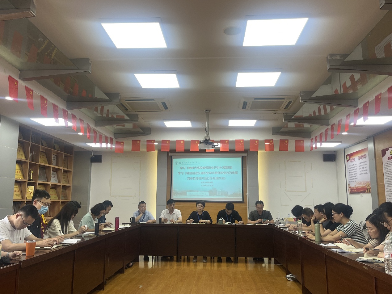 接著,范自盛副院長解讀了《福建船政交通職業(yè)學(xué)院教師職業(yè)行為負(fù)面清單及師德失范行為處理辦法》,幫助全體教職工深入了解文件條款。全體教職員工要有底線思維,要自覺加強(qiáng)師德修養(yǎng),嚴(yán)格遵守師德規(guī)范,嚴(yán)以律己,為人師表,把教書育人和自我修養(yǎng)結(jié)合起來,堅(jiān)持以德立身、以德立學(xué)、以德施教、以德育德。