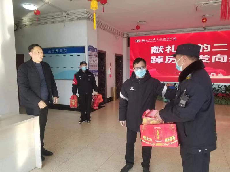 2023年1月19日上午,時值癸卯新年來臨之際,學(xué)院黨委副書記陳宜大攜安全保衛(wèi)處處長潘忠代表學(xué)校黨政,深入走訪慰問了寒假期間堅(jiān)守崗位的一線工作人員,向他們的辛勤工作表示充分肯定,并送上新春的問候和祝福。