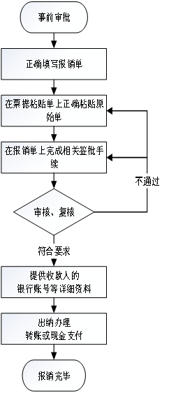 日常經(jīng)費報銷的一般流程:報銷人整理報銷單據(jù)并填寫對應(yīng)費用報銷單→ 在票據(jù)粘貼單上正確粘貼原始單→項目相關(guān)授權(quán)人審批簽字→財務(wù)部門審核、復(fù)核、編制憑證→出納辦理轉(zhuǎn)賬或現(xiàn)金支付。
