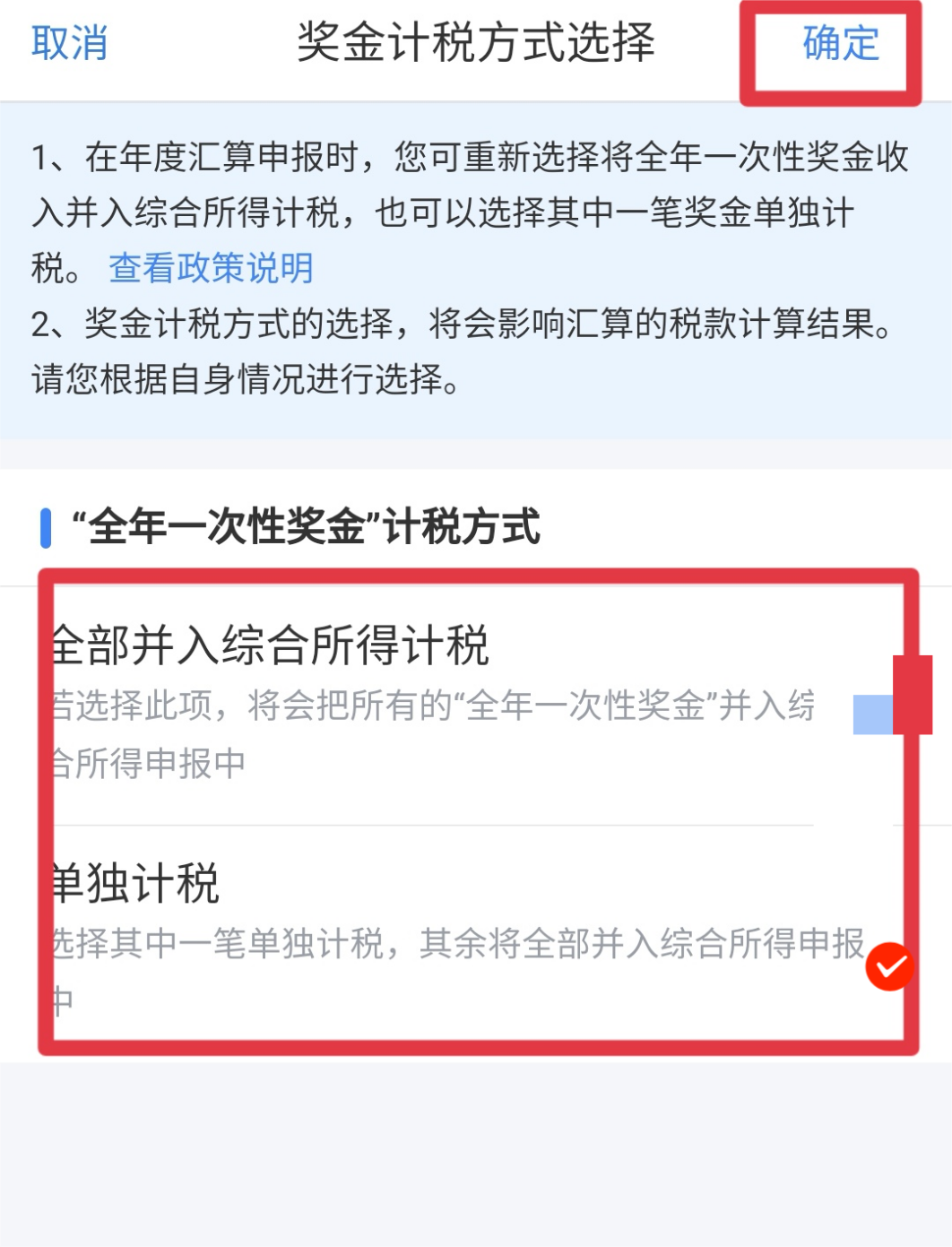個(gè)人可以在申報(bào)提交前,先后將“全年一次性獎(jiǎng)金”計(jì)稅方式選擇為 “全部并入綜合所得計(jì)稅”、“單獨(dú)計(jì)稅”方式,看看哪一種方式下“應(yīng)補(bǔ)退稅金額”對(duì)自己比較有利(即:退稅更多、或者補(bǔ)稅更少)。
