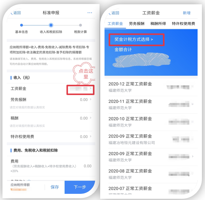 特別注意“年終一次性獎(jiǎng)金”計(jì)稅方式的選擇,因?yàn)椴煌?jì)稅方式會(huì)導(dǎo)致稅額不同,您在正式提交申報(bào)前可比較選擇最優(yōu)計(jì)稅方式。具體方法為:點(diǎn)擊“工資薪金”進(jìn)入【獎(jiǎng)金計(jì)稅方式選擇】,可選擇將獎(jiǎng)金【全部并入綜合所得計(jì)稅】,或選擇【單獨(dú)計(jì)稅】,點(diǎn)擊【確定】然后返回申報(bào)界面查看不同計(jì)稅結(jié)果。