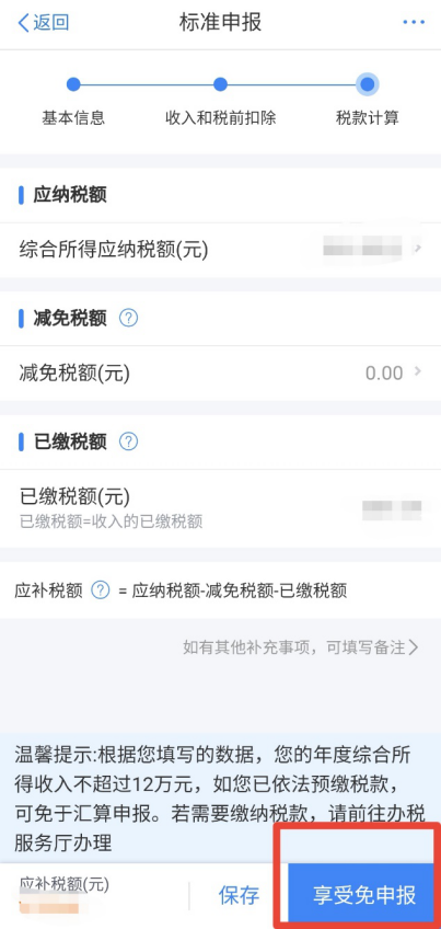 若您收入不足12萬元且有應(yīng)補(bǔ)稅額,或收入超出12萬元但應(yīng)補(bǔ)稅額≤400元,申報(bào)提交后無需繳款,點(diǎn)擊【享受免申報(bào)】。