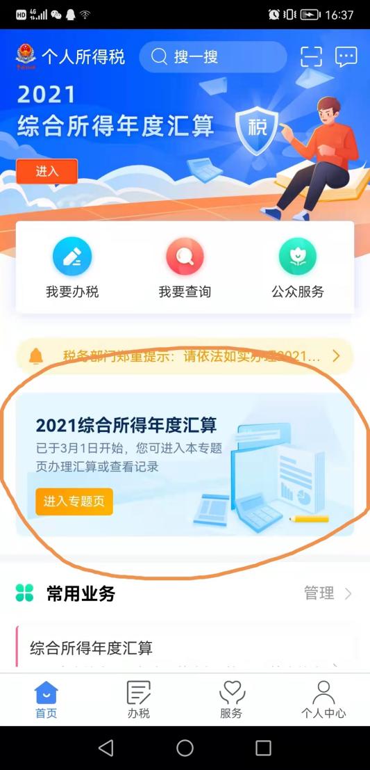 登錄“個(gè)人所得稅”APP,從首頁(yè)中間部位點(diǎn)擊【綜合所得年度匯算】