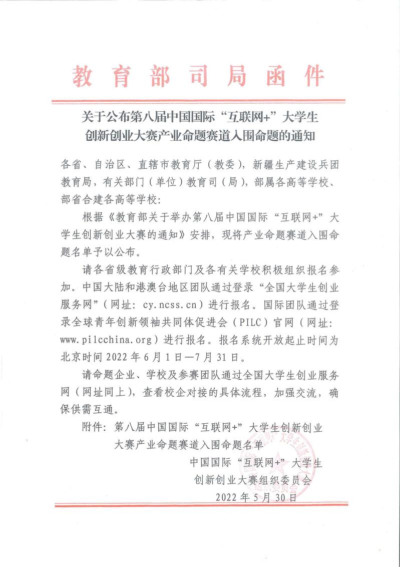 關(guān)于公布第八屆中國國際“互聯(lián)網(wǎng)+”大學(xué)生創(chuàng)新創(chuàng)業(yè)大賽產(chǎn)業(yè)命題賽道入圍命題的通知