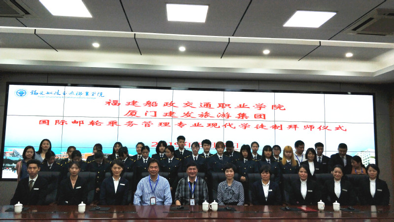 5月5日下午,航海技術(shù)系在北區(qū)1號樓6樓會議室舉行國際郵輪乘務管理專業(yè)現(xiàn)代學徒制拜師儀式?!耙话輲煾登谠耘?,二拜師傅傳技藝,三拜師傅承師恩?!北敬伟輲焹x式是現(xiàn)代學徒制試點的重要環(huán)節(jié),通過拜師儀式明確師徒關(guān)系、雙方職責,為今后開展人才精準培養(yǎng)打好基礎(chǔ)。教學副院長高汝武、廈門建發(fā)旅游集團人事總監(jiān)李桃、航海技術(shù)系主任、郵輪乘務管理專業(yè)教師及2018級國際郵輪乘務管理專業(yè)21名學生參加了拜師儀式。