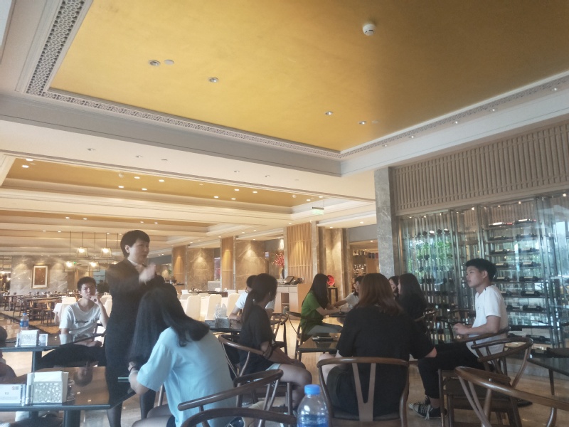 一組同學(xué)隨著劉征老師參觀的同時(shí),另一組同學(xué)并沒(méi)有閑著,酒店的另一名Linda總監(jiān)給我們分享她在酒店的就業(yè)生涯,剛進(jìn)公司時(shí)作為酒店的禮儀擔(dān)當(dāng),并用她的微笑給客人帶來(lái)了親切感和贊美,所以她告訴我們,微笑在服務(wù)中是至關(guān)重要的。