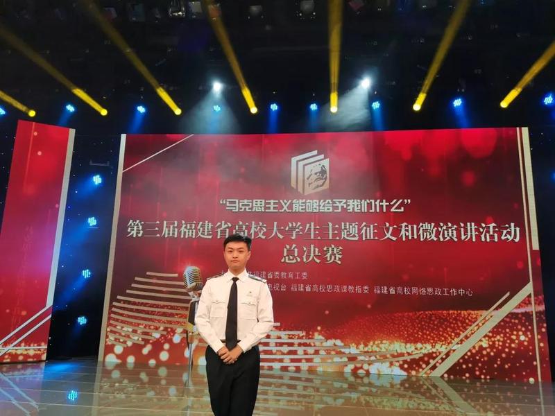 在比賽活動中,林祥宇同學(xué)將馬克思主義與對祖國的深情表達(dá)的淋漓盡致。經(jīng)過一番激烈的切磋與較量,我系18港口航運管理的林祥宇在此次大賽最終獲得了第三屆福建大學(xué)生主題征文和微演講高職高專組二等獎。