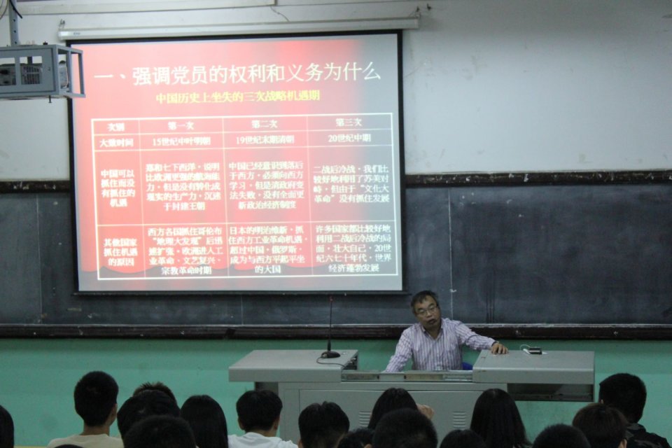 2019年10月17日晚,輪機工程系主任、黨總支統(tǒng)戰(zhàn)委員兼青年委員陳清彬同志,給2019級新生上了本學(xué)期的形勢政策課——新時期黨員要求。