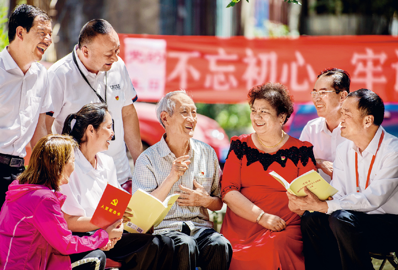 每年“七一”都是每個共產(chǎn)黨員最驕傲自豪的時刻,也是銘記初心和使命、重整行裝再出發(fā)的時刻。圖為201871日,烏魯木齊市天山區(qū)二道橋片區(qū)福壽巷社區(qū)的“民族團結(jié)模范庭院”里,各族黨員圍坐在一起慶祝黨的生日。人民圖片金煒/