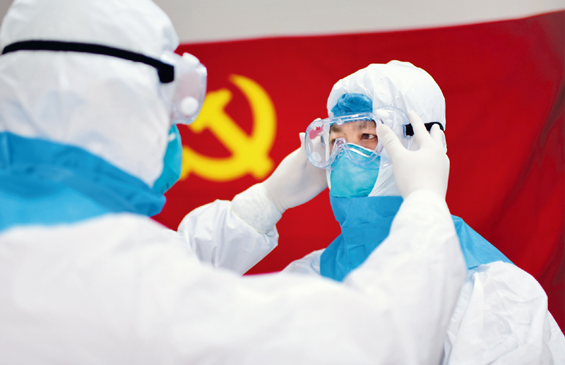 在抗擊新冠肺炎疫情的戰(zhàn)線上,廣大黨員干部不忘初心、牢記使命,挺身而出、沖鋒在前,讓黨旗在疫情防控斗爭第一線高高飄揚。圖為202026日,重慶市璧山區(qū)人民醫(yī)院感染疾病科疫情防控專家組副組長、黨員丁飛穿好隔離服,準(zhǔn)備前往隔離病房。 人民圖片胡悅建/