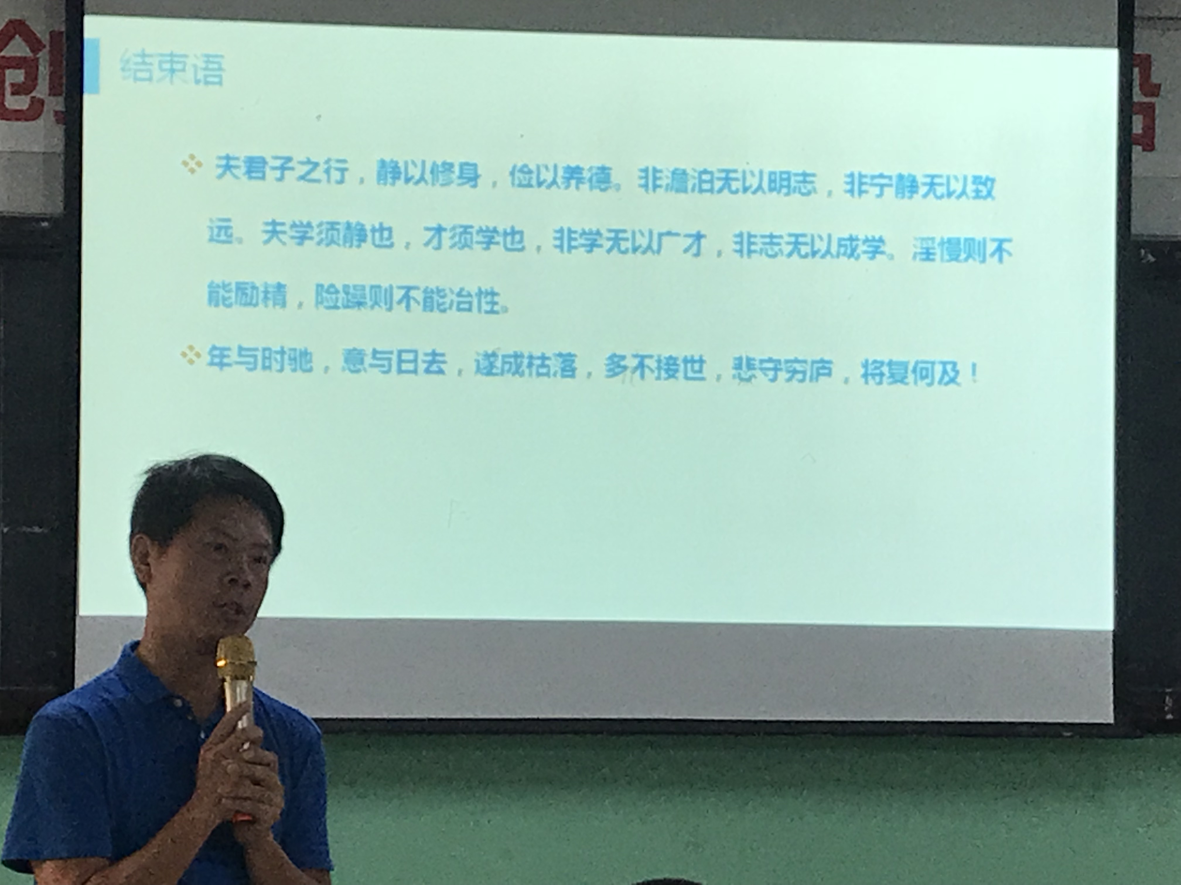 老師以“ 夫君子之行,靜以修身,儉以養(yǎng)德。非澹泊無(wú)以明志,非寧?kù)o無(wú)以致遠(yuǎn)。夫?qū)W須靜也,才須學(xué)也,非學(xué)無(wú)以廣才,非志無(wú)以成學(xué)。淫慢則不能勵(lì)精,險(xiǎn)躁則不能冶性。”“年與時(shí)馳,意與日去,遂成枯落,多不接世,悲守窮廬,將復(fù)何及!”兩句名言結(jié)束了本場(chǎng)講座。