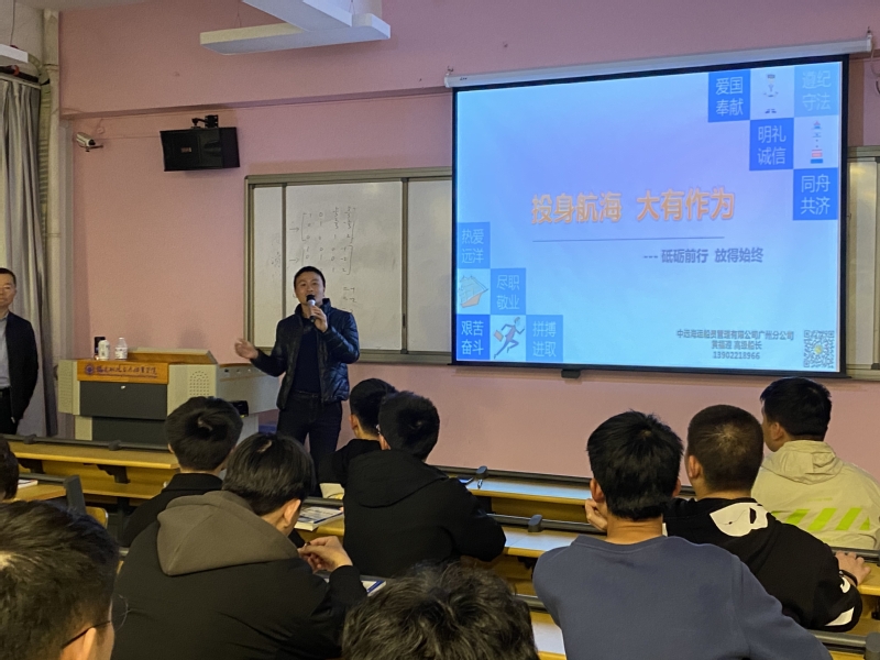 3月23日晚,中遠(yuǎn)海運(yùn)船員管理有限公司廣州分公司副總經(jīng)理黃福遵、開(kāi)發(fā)部副經(jīng)理何璇一行來(lái)到我院分別為2022屆、2023屆做企業(yè)文化宣講以及航海類學(xué)生職業(yè)生涯規(guī)劃。